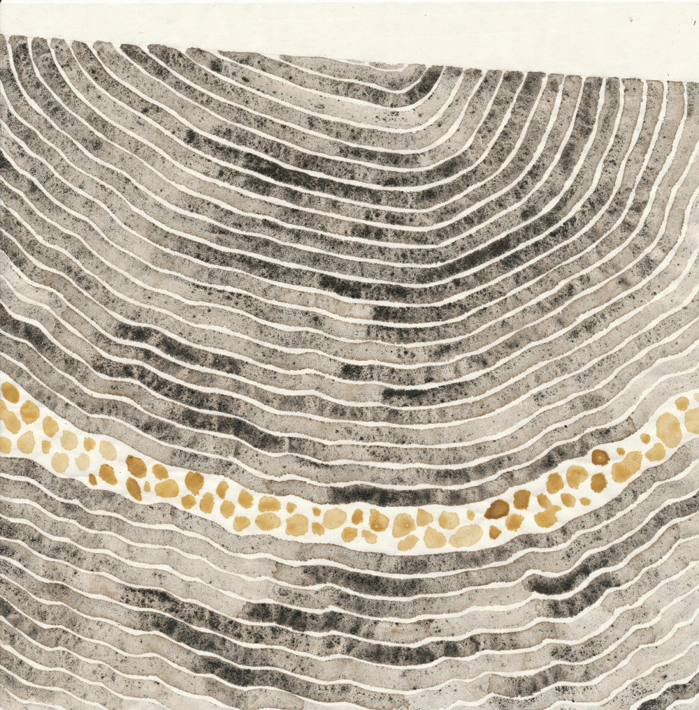 Esther studied geography and cartography at the University of Victoria. She uses tools from these disciplines to create geological drawings, some of which are created from ink made from the rocks that she collects.