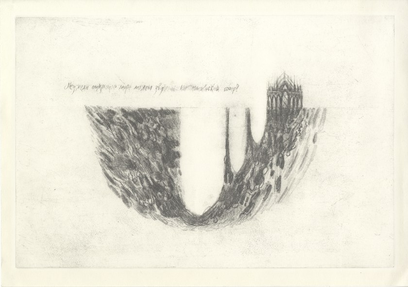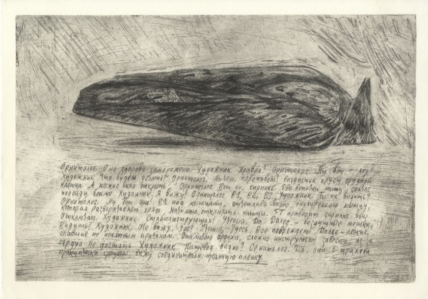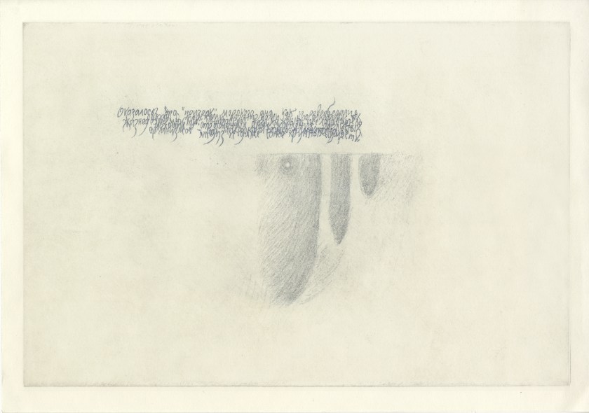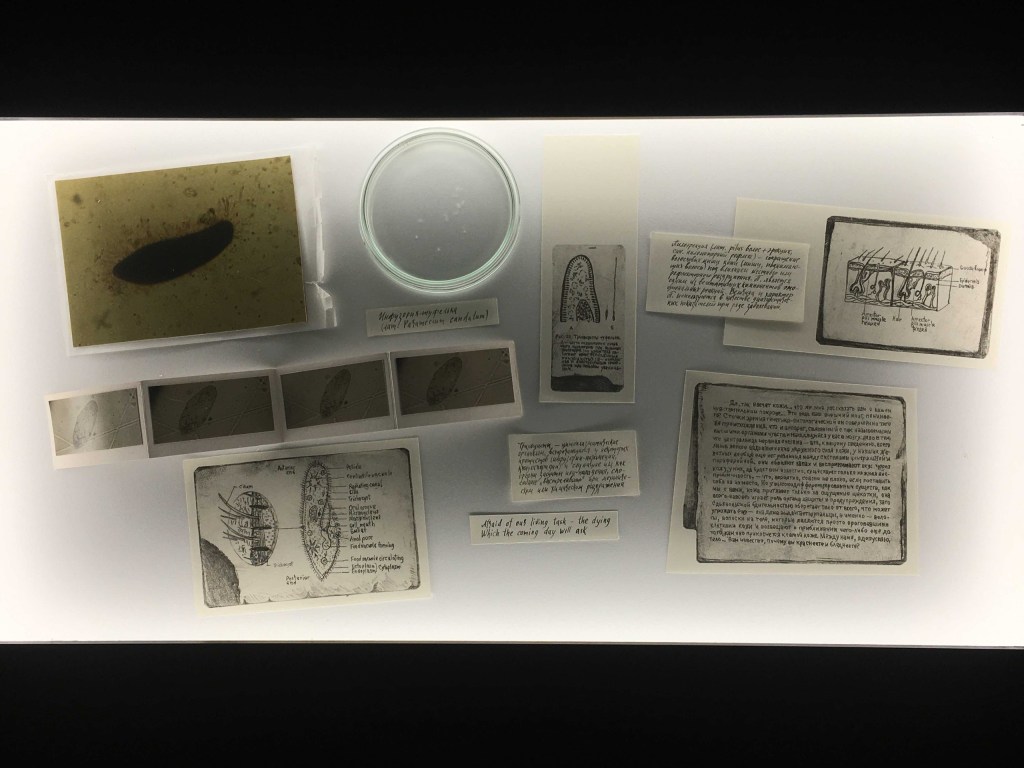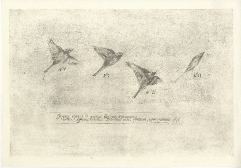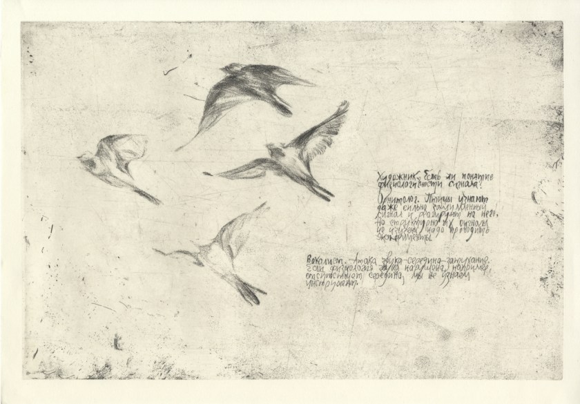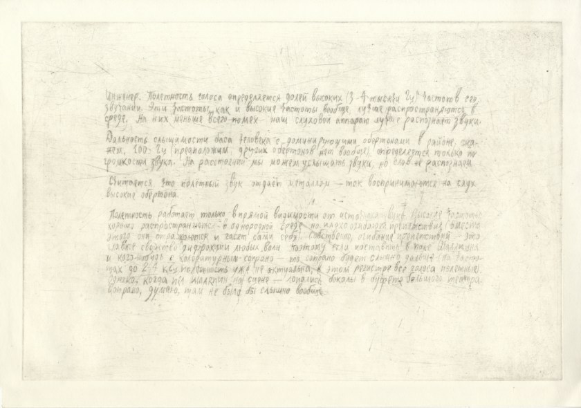 Marsyas’s Diary is a collection of delicate etchings inspired by the Marsyas project. These etchings include sketches, notes, letters, and descriptions. The pages in this collection contain detailed, accurate drawings of tiny birds and complex diagrams showing the artist’s process, while other pages seem to depart from reality and merge into a surreal and abstracted world. Egorova’s use of historical printing processes in this work is successful as she describes the contrasting, futuristic and almost sci-fi appearance of Marsyas.