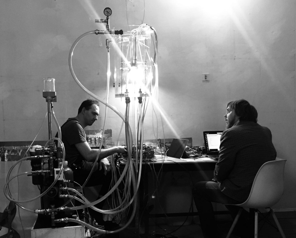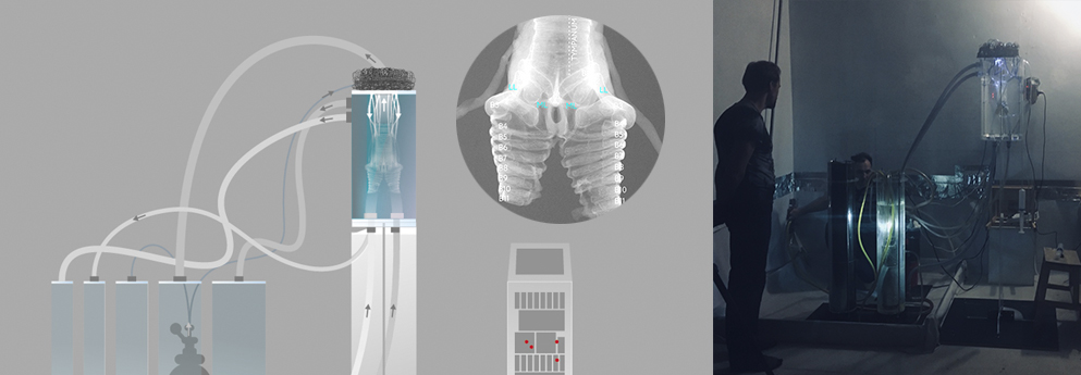 This installation/sculpture/sound work brings together science and art in a poetic investigation of the intricacies of nature found in the vocal organ of mocking birds. Egorova, alongside a team of scientists and engineers, has spent the last five years developing Marsyas. This complex work is an enlarged, recreation of a mocking bird’s sound organ, suspended in a hydraulic environment.