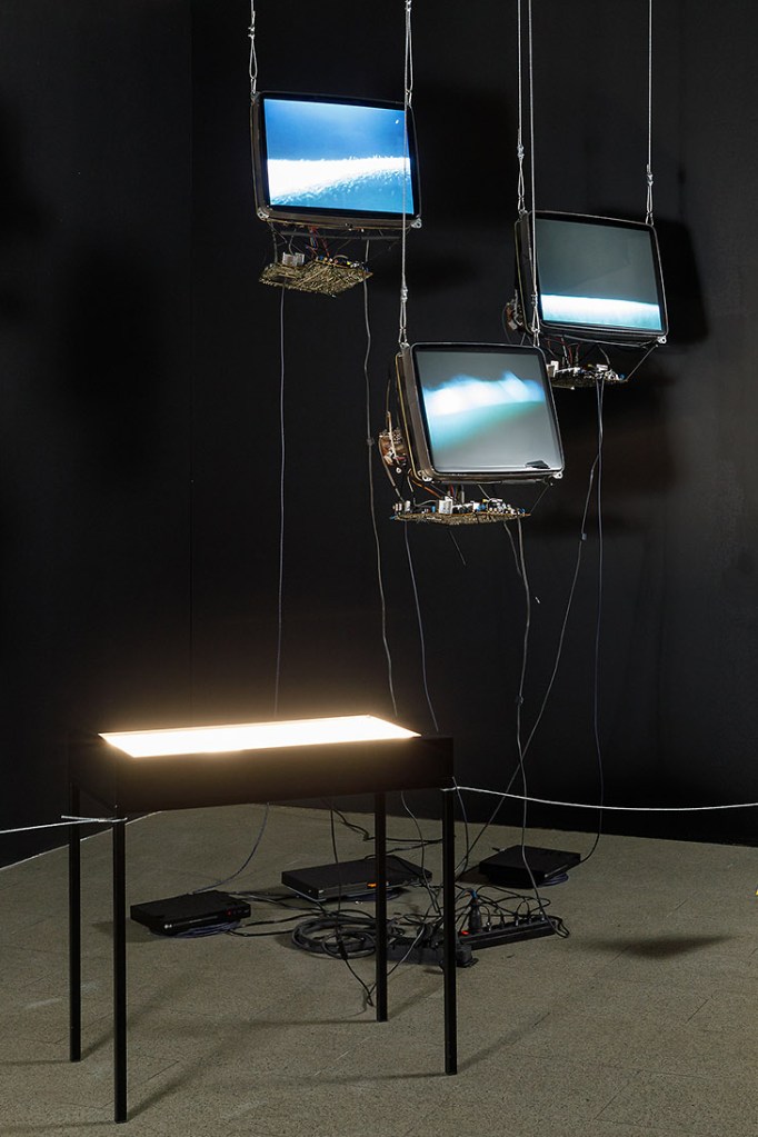 Video installation – three suspended cathode-ray tubes demonstrating video of piloerection (pilomotor reflex) and horizontal lightbox